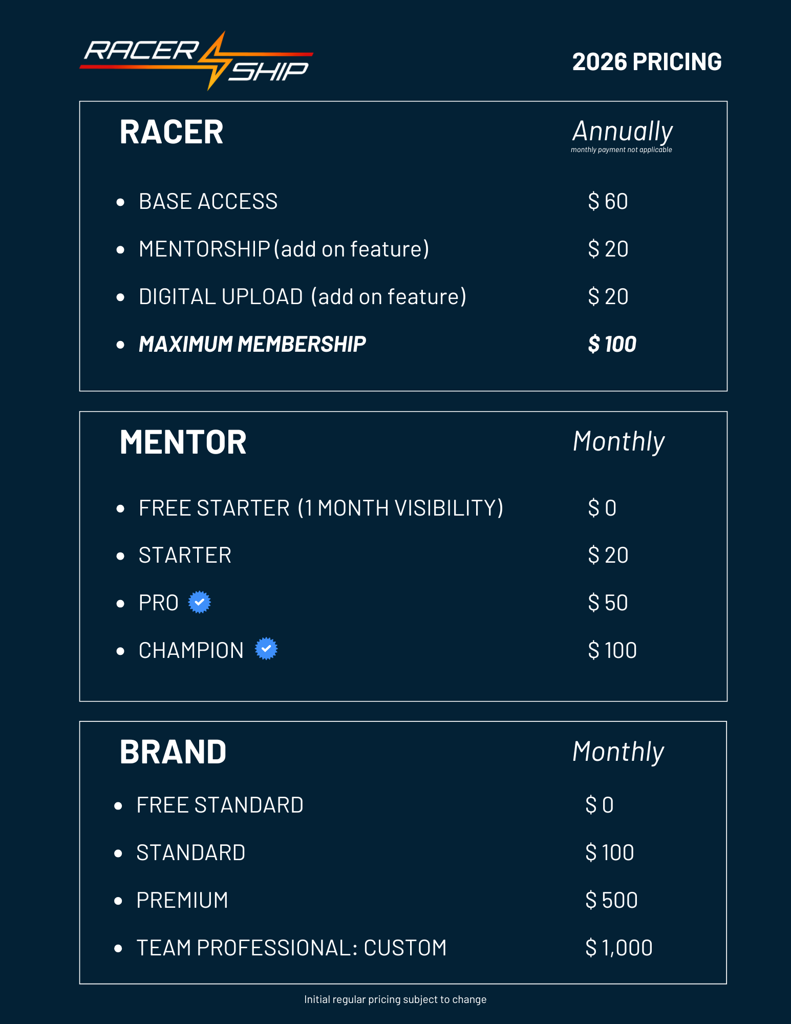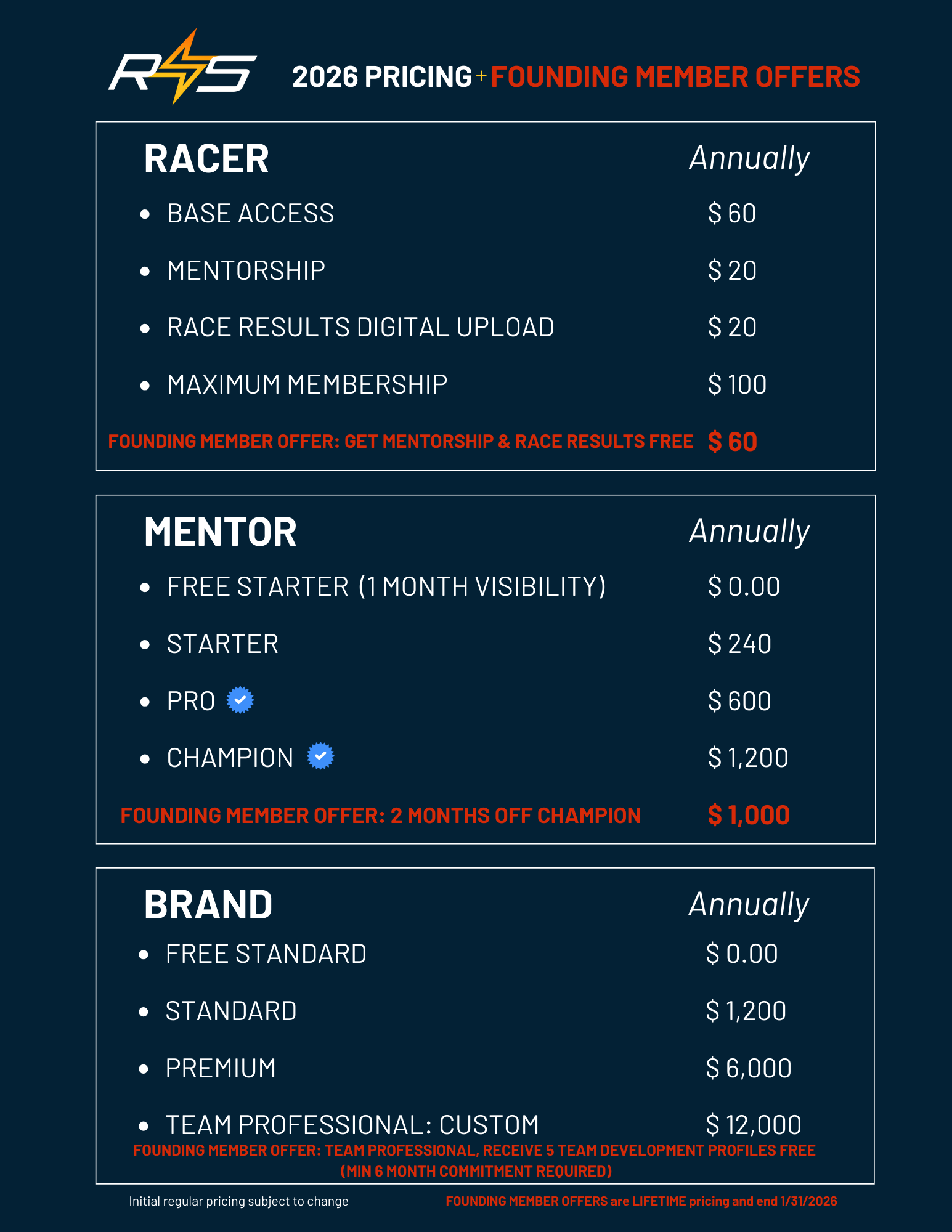 6 month commitment for mentors and brands, with monthly payment options available — scroll to below. Racers require yearly commitment for best results.